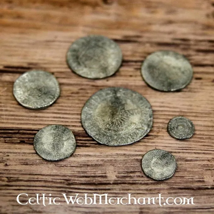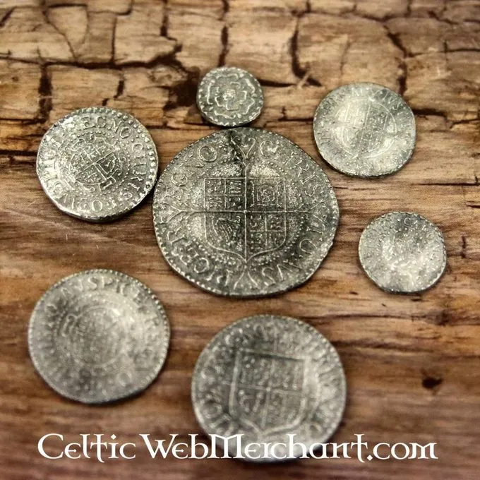 Ceci est un ensemble de pièces de monnaie de l’époque du roi Charles Ier d’Angleterre. Il régna entre 1625 et 1649. Croyant au droit divin des rois et marié à une reine catholique romaine, des conflits avec la classe supérieure protestante et le parlement surgirent. Cela a conduit à sa capture, procès et exécution en 1649. L’ensemble se compose d’un shilling, sixpence, groat, threepence, halfgroat, penny et halfpenny, tous en étain.