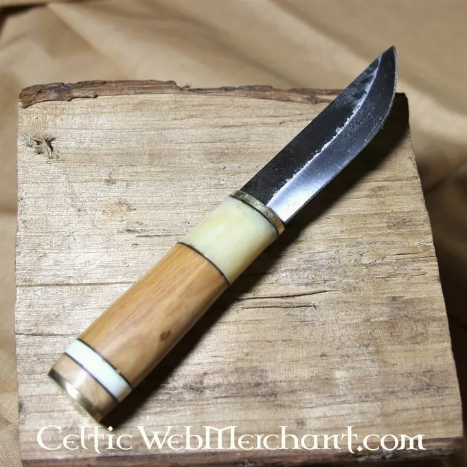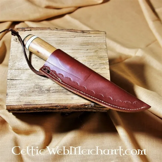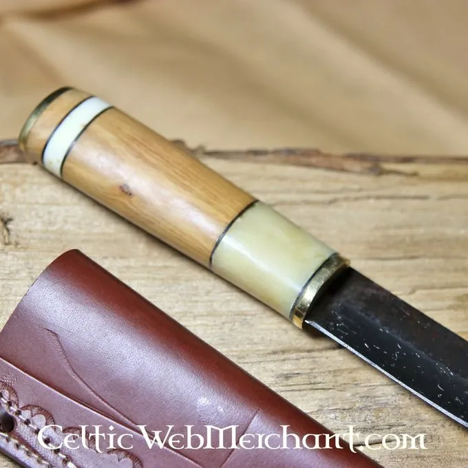 De tels couteaux ont été utilisés au début du Moyen Âge, par exemple par les Mérovingiens, les Anglo-Saxons et les Vikings. Un couteau utilitaire pratique était indispensable pour les travaux quotidiens. Ce couteau a une lame forgée à la main et une poignée de décorations en os, bois et laiton. Il est livré avec une gaine en cuir marron avec un motif décoratif. Au final, c’est un couteau avec de beaux détails et un atout pour tout viking, germanique, anglo-sax ou franc.