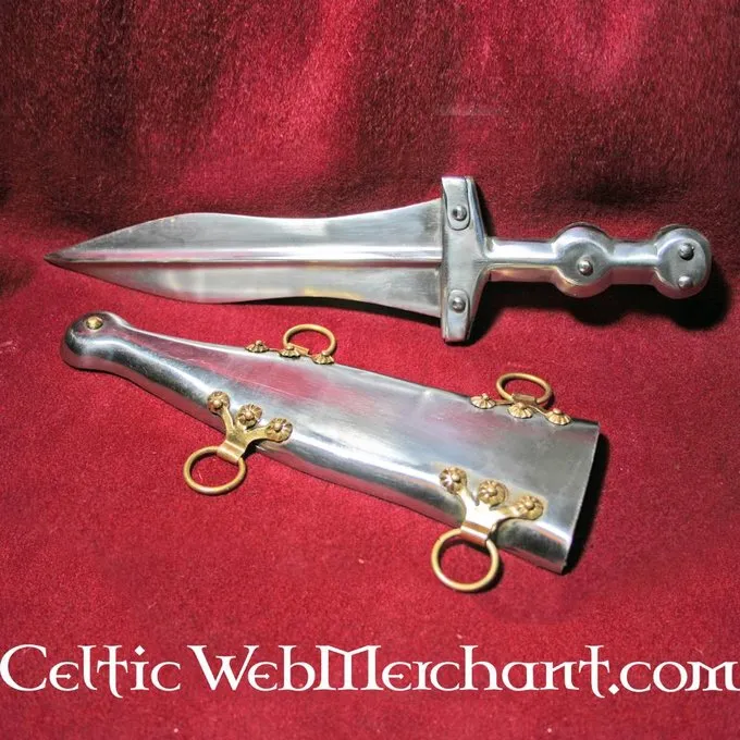 Cette dague est une réplique d’un original à partir du 1er siècle après JC trouvé en Rhénanie. Pugiones de ce genre ont été utilisés partout dans l’Empire romain, mais ils ne faisaient pas partie de l’équipement standard de la Legionair. Soldats romains probablement les ont achetés comme une propriété privée.