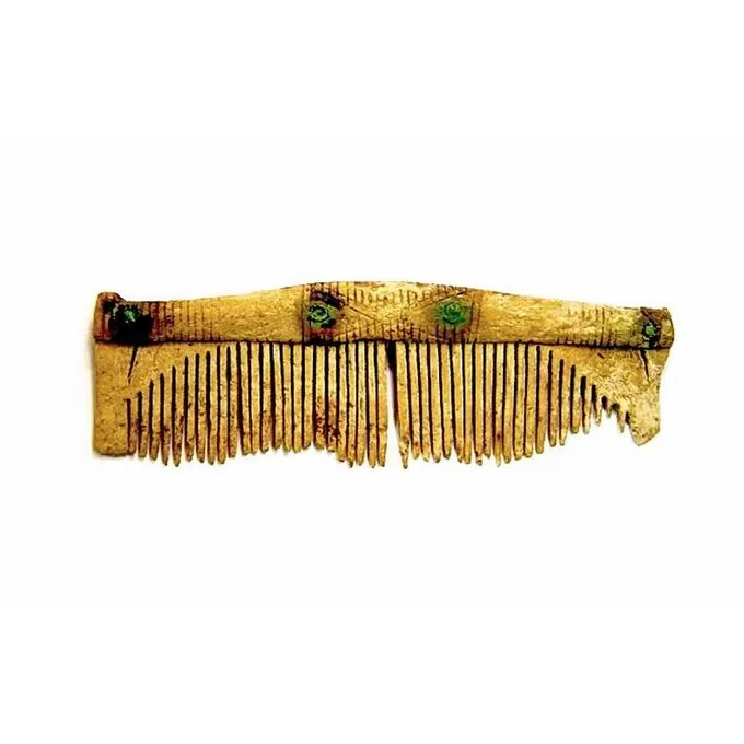 Cette réplique faite à la main est en os naturel. Elle mesure 12 x 4 x 1 cm et contient des rivets de bronze. Cette technique de fabrication de peigne était déjà utilisée par les tribus germaniques.