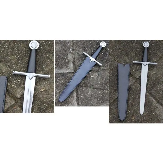 Détails de produit: Longueur: 44 cm / Longueur de lame: 31 cm / Longueur de poignée: 13 cm / Poids: 650 g / Type d’acier de la lame: EN45 carbon steel hardness 48 HRC. / Tranchant: 3 mm (battle-ready) / Soie: full tang construction / Pommeau: screwed / Po