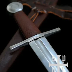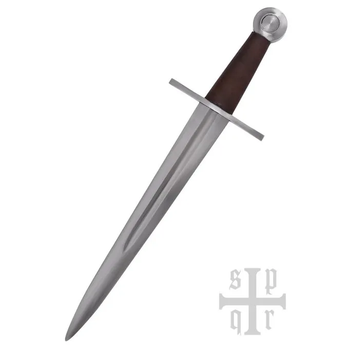 Poignards étaient très populaires au Moyen-Age. Le poignard était une arme largement utilisée par les chevaliers, archers, lanciers, fantassins, etc. En plus de leur arme la plus importante, comme l’arc, le poignard était important pour un sur un combat et d’autodéfense. Le poignard a été porté à la ceinture afin qu’il puisse être saisi rapidement dans des situations d’urgence. Ce poignard est basé sur les originaux haut Moyen Age. Il a une poignée en cuir marron avec un noyau en bois, une pleine saveur et un pommeau riveté. La garde roue et arçons droite sont complètement dans le style du Haut Moyen Age. Le poignard est livrée avec un fourreau très luxueux en cuir de haute qualité.